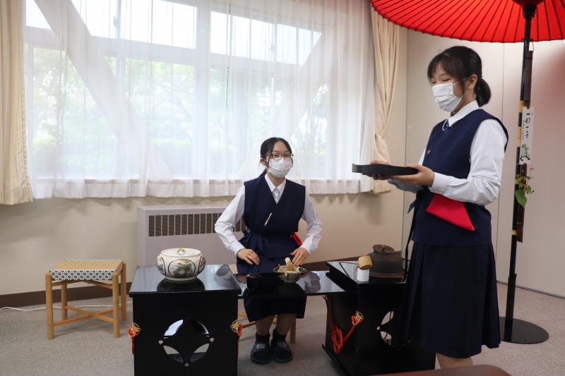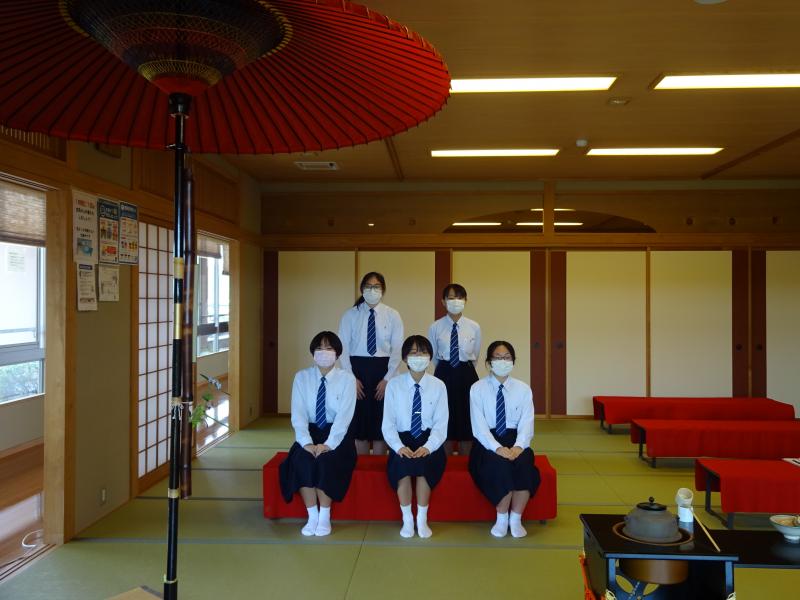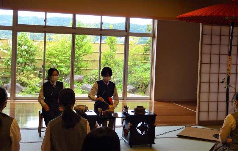 参加校は、飯田・門前・能登・輪島の4校です。本校は立礼席を担当し、部長の坂本さんをはじめ3人がお手前を披露しました。小規模とはいえ他校とのお茶会はコロナ後初めてで、緊張はありましたがとてもよい経験になりました。