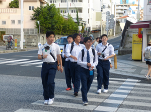1日目、さっそく『国際通り』にて班別研修が行われました。国際通りは、沖縄県庁前から1.6km続く観光ストリートで、道路の両側にはTシャツやかりゆしウェア、沖縄クラフト品やスイーツなど沖縄らしいアイテムをそろえたショップが立ち並んでいます。ストリート入り口のシーサーに歓迎を受けながら生徒たちは、沖縄ブルーシールのアイスを食べていました。32度の暑さにアイスがすぐに溶けてしまって大変でしたが、沖縄の人が親切に熱中症対策を教えてくれ、おすすめのお店なども教えてくれました。ストリートにはアメリカ文化にも影響を受けた沖縄ならではの飲食店も充実しており、生徒たちはソーキそばやステーキなど班ごとに夕食を楽しみました。中にはミミガーを食べ、ミミガーがすごく好きという生徒もいました! 国際通り沿いにある南西観光ホテルに宿泊し、生徒たちは国際通りの夜のにぎわいを感じながら明日に備えました。