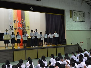 和太鼓部、陸上部、ソフトテニス部の表彰伝達式が行われました。