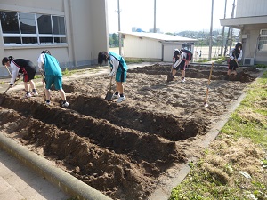 JRC部が今年もさつまいも作りに挑戦し、畝を作りを行いました。