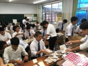 敬老会で配付される記念品に輪島高校オリジナル商品が使用され、ラッピングのボランティアを総合学科3年生34名が行いました。