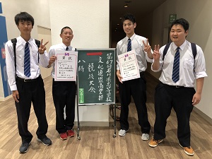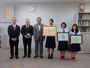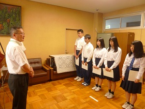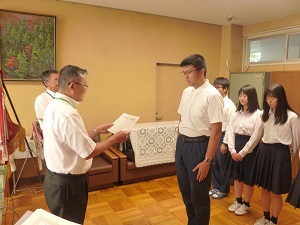 8月29日(水)、県庁を訪れ全国総文最高賞受賞を報告し、田中 新太郎 教育長よりお祝いの言葉をいただきました。練習の大変さや本番の気持ちなどを聞かれ、「練習は大変だけど、太鼓が大好きだから大丈夫です。」「本番はとても緊張したけど、それ以上にとても楽しめました。」と答えていました。
