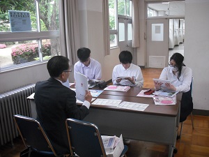11月3日に行われる地域探究学習「ポスターセッション」のため、実習班が輪島朝市組合の方を招いてレシピ開発の打ち合わせを行いました。