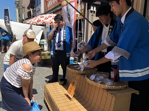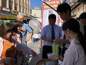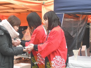 輪島朝市感謝祭にて、1年生6名と2年生2名がふるまい鍋の配布ボランティアを行いました。