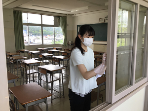 また、3年生の下校後には明日の2年生の登校に向けて、教職員による校内の消毒も行われました。
