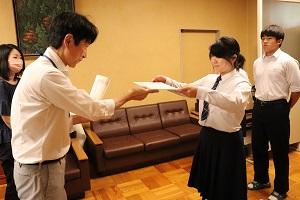 9月7日には校長室で認証式が行われ、信任を受けた5名の生徒に対し、上野校長から認証状が手渡されました。