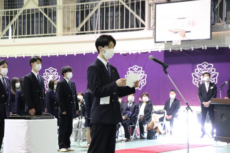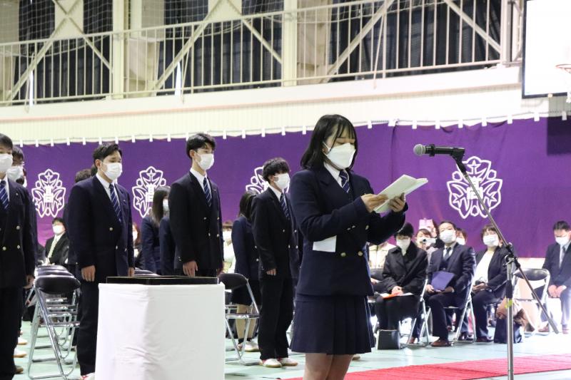 式典では、各クラスの代表4名が卒業証書を受領し、生徒会長の大端遼さん(2年生)が送辞を、山岸海琴さん(3年生)が答辞を述べ、高校生活の思い出を振り返りました。