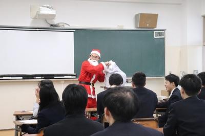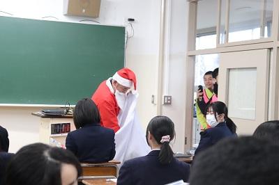 教室にサンタクロースが登場すると、生徒から「いえ~い!!(拍手)」と大盛り上がりでした♪
