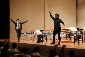 平野校長からの「ノるところはノる キくところはキく」のとおり、生徒は盛り上がるところは盛り上がり、みんなで楽しそうに手拍子などをしていたところが印象的でした。指揮者体験の部では輪島高校から新典さんが指揮者として参加しました。とても貴重な体験をすることができました。最後は生徒会長の北出さんより「素晴らしい演奏をありがとうございました。」と花束が手渡され、締めくくりとなりました。