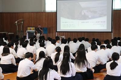 その後,金沢大学の青木先生から地震や津波からどのように身を守るか、また、能登半島の地形がこれまでの度重なる震災によって形作られ、私たちが大切にしている生活や風土や文化はその地殻変動の上で成り立っているものであるということについてご講演いただきました。単に震災に対する怖いという観念ではなく、故郷に対する新しい視点を得られた時間になったと思います。