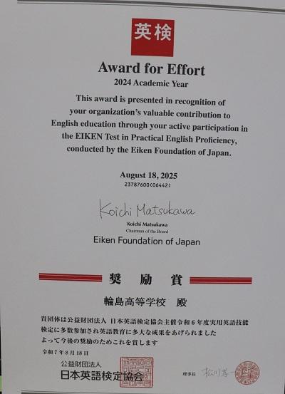 これは、英検受験を通して生徒の英語力向上を目指した団体に贈られます。