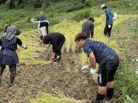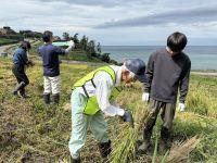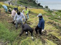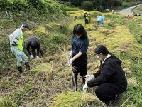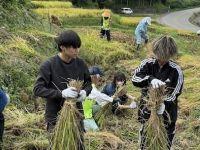 千枚田愛耕会の方に稲の刈り方や束ね方などを教えていただきながら、果敢に取り組む姿が素敵でした。