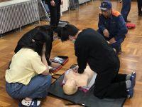 AEDに初めて触れる生徒たち。消防署の方に積極的に質問をしながら、自分が助ける場面を想定して取り組んでいました。