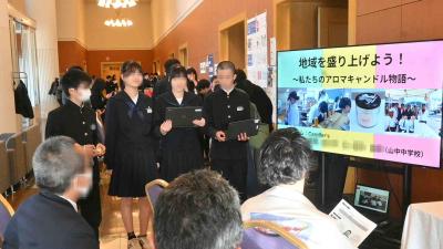 12月13日(土)ホテルアローレで「KAGA STEAM FES 2025」が開催され、山中中からは2年生の2つのグループが地域を盛り上げる目的で総合的な学習の時間に取り組んだMV制作やアロマキャンドルの制作・販売について発表しました。今年度は、ポスターセッション形式で行われ、山中中学校のブースを訪れた参加者から、たくさんの質問が寄せられました。