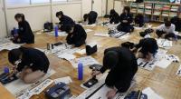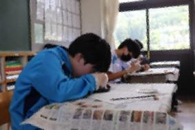 2月2日(金) 山中漆器産業技術センターより講師の先生方をお招きして、蒔絵体験を実施しました。生徒たちは,黒小皿に漆で絵を描き、漆が乾いたところに金粉・銀粉を蒔くという作業を体験しました。細かい作業でしたが、自分のイメージどおりに仕上げようと、各自が真剣に制作に取り組み、伝統的な文様等にとらわれない一人ひとりのセンスが輝く作品ができました。この後、山中漆器産業技術センターの方々に最後の工程の作業をしていただき、完成となります。手元に届くのがとても楽しみです。