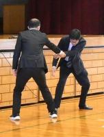 また、不審者に腕や胸ぐらをつかまれたり、後ろから抱きつかれたりしたときに逃げるための護身術を教わり、実際にペアで練習をしました。