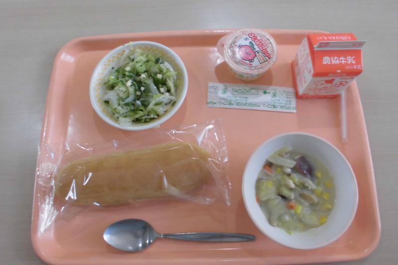コッペパン グリーンサラダ 白菜とサツマイモのクリーム煮 りんごゼリー牛乳
