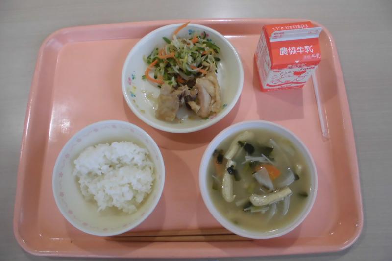 わかめごはん 油淋鶏 さわやか和え 大根のみそ汁 牛乳