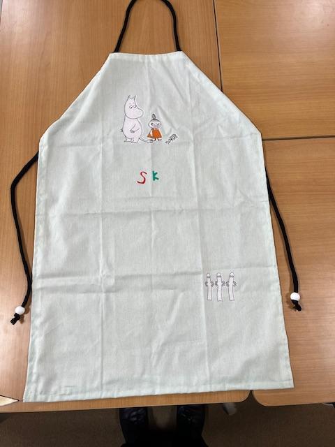 写真をご覧ください。6年生が手作りのエプロンをプレゼントしてくれました。しかも、イニシャル入りです。