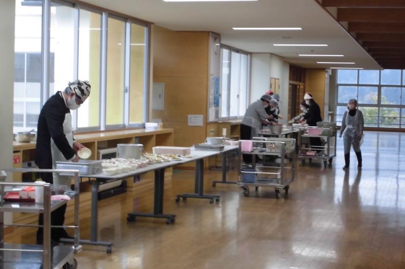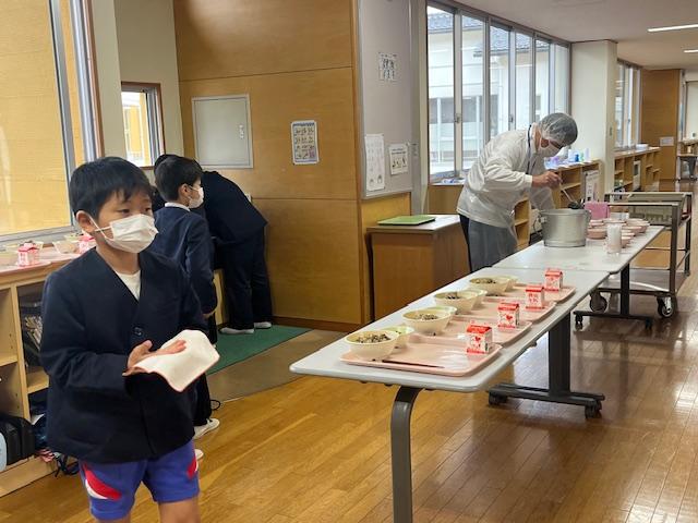 今週、インフルエンザの感染拡大が心配されたため、給食は教室などに分れて食べています。支援員さんにも準備を手伝っていただきました。
