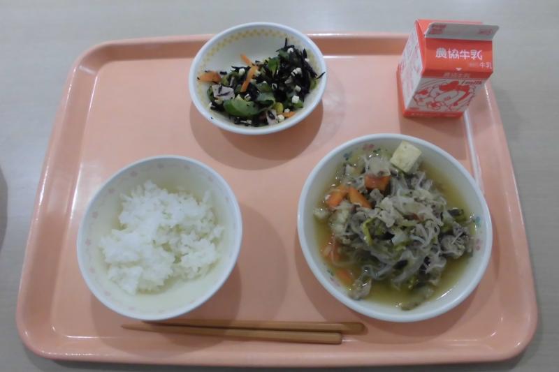 ごはん ひじきのマリネ すき焼き風煮 牛乳