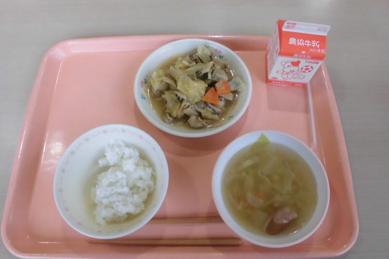 ごはん キャベツと厚揚げのみそ炒め ウインナースープ 牛乳