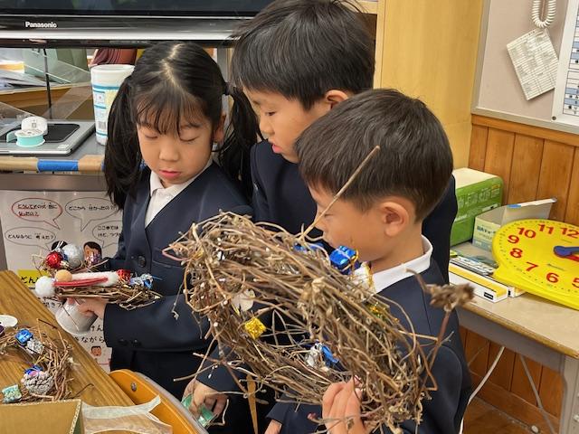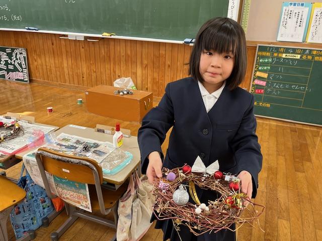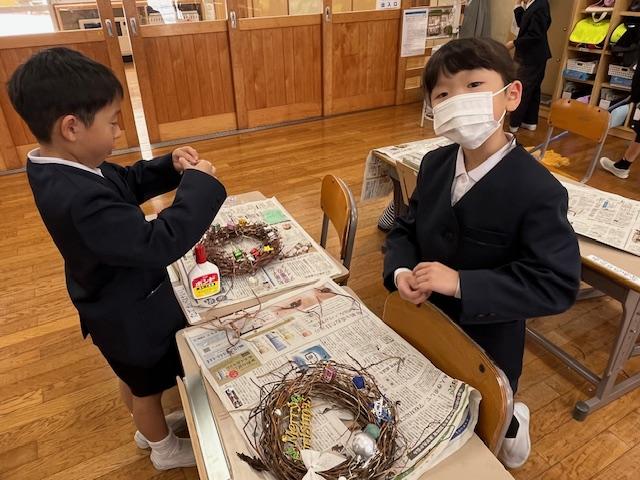 1年生の図工の時間。Xmasの音楽を聴きながら、Xmasリースを作っていました。