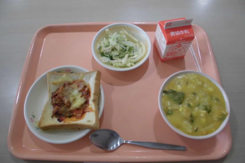 ピザトースト マカロニサラダ パンプキンシチュー 牛乳