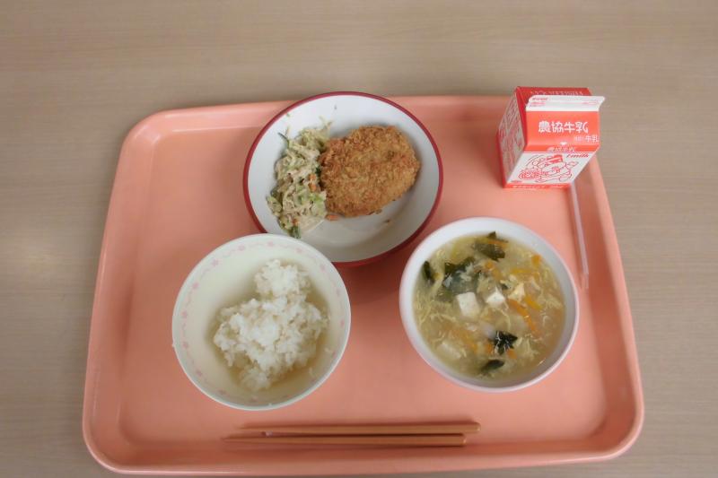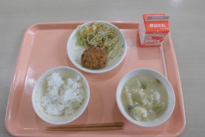 ごはん メンチカツ ひじきの炒め物 じゃがいものみそ汁 牛乳