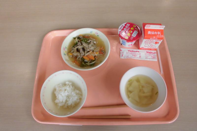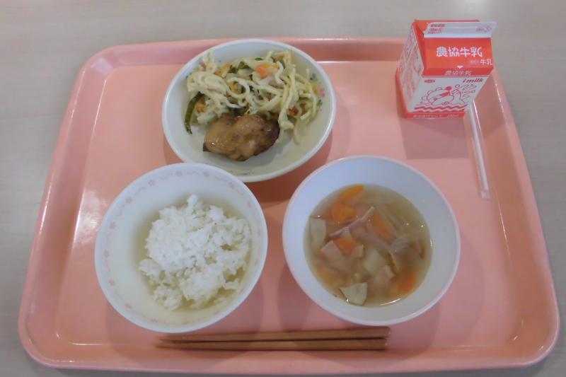ごはん 鶏肉の照り焼き 大根と小松菜のサラダ 具だくさん中華スープ 牛乳