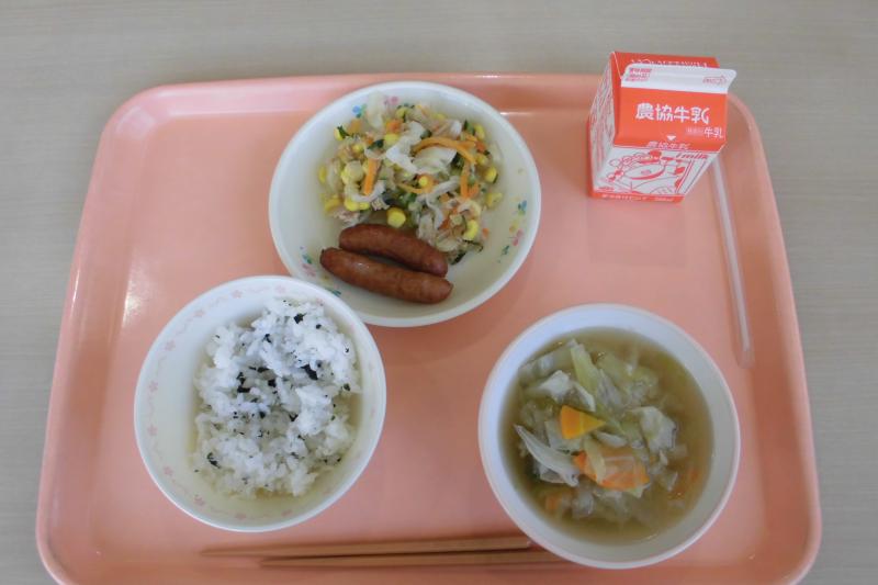 わかめごはん 焼きウインナー ツナサラダ 野菜スープ 牛乳