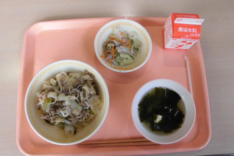 能登牛丼 キャベツとコーンの中華サラダ すまし汁 牛乳