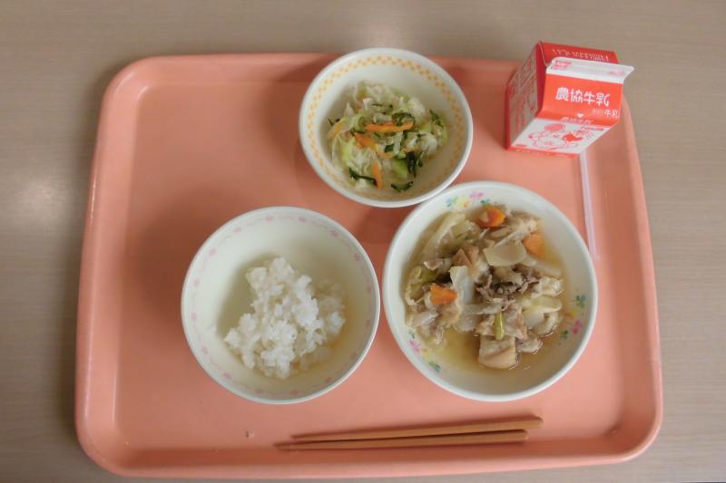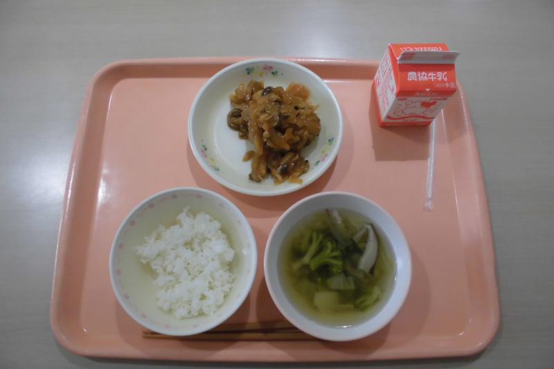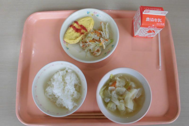 ごはん オムレツ 切り干し大根のピリ辛炒め キャベツとベーコンのスープ 牛乳
