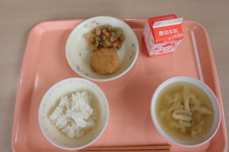 さつまいもごはん メンチカツ うの花炒り煮 すまし汁 牛乳