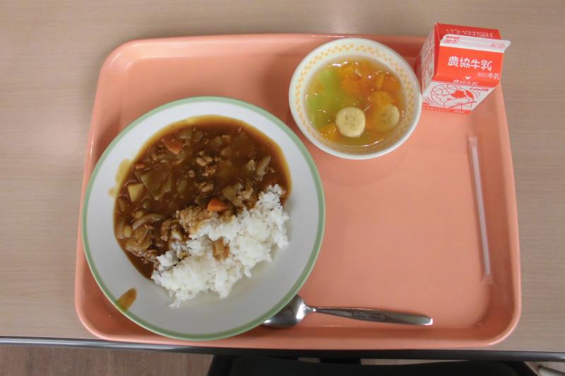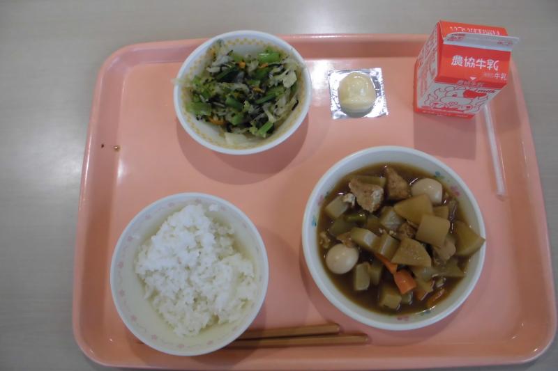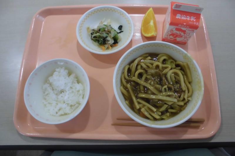 ごはん おかかあえ カレーうどん オレンジ 牛乳