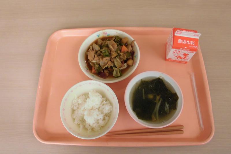 ごはん 豚肉のカレーソテー わかめスープ りんごゼリー 牛乳