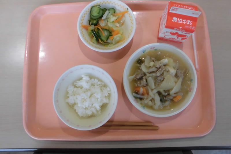 ごはん 肉と野菜の炒め物 中華スープ 牛乳