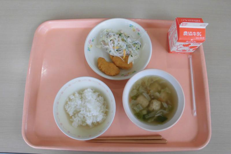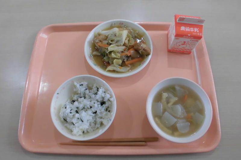 ゆかりごはん チキンナゲット 切り干し大根の含め煮 けんちん汁 牛乳