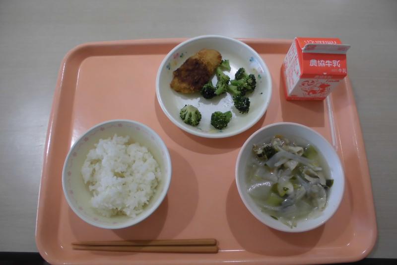 ごはん 鶏肉のカレー揚げ 小松菜のおひたし みそ汁 牛乳
