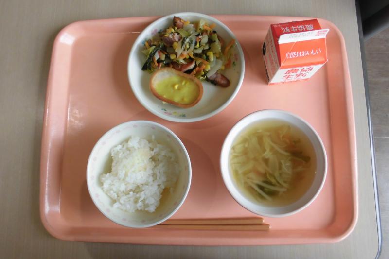 ごはん さけのみそマヨ蒸し ウインナーソテー 野菜スープ 牛乳