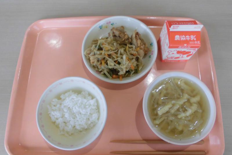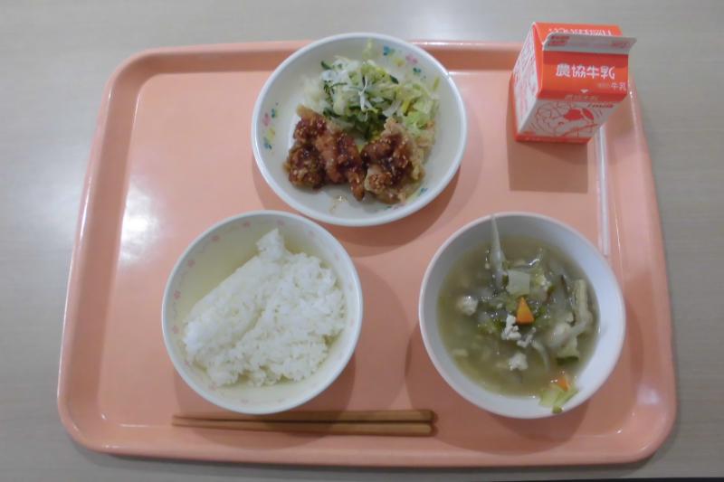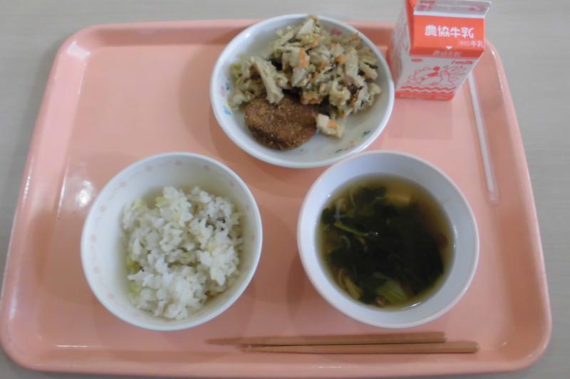 ごはん 鶏肉のから揚げ ごぼうサラダ わかめスープ 牛乳