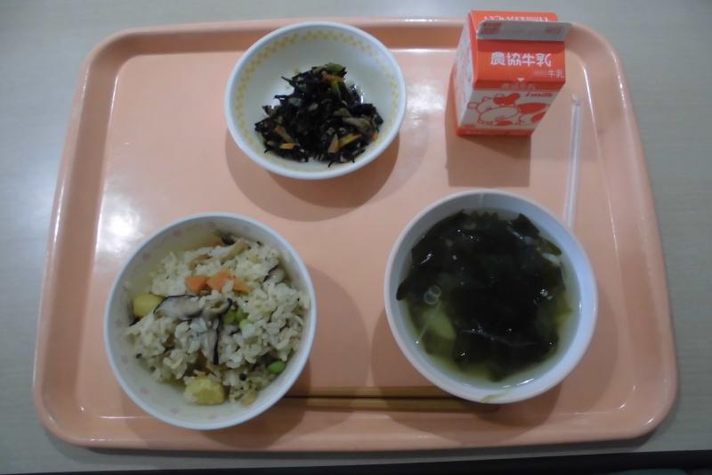 秋の香りごはん ひじきのピリ辛炒め じゃがいものみそ汁 牛乳