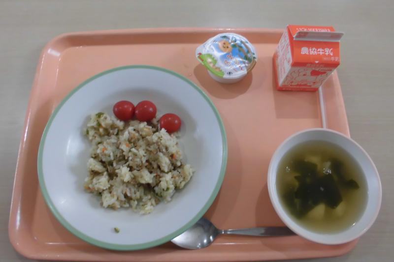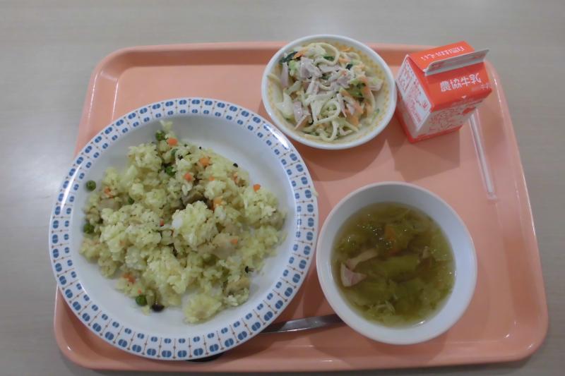 カレーピラフ スパゲッテイサラダ レタスのスープ 牛乳