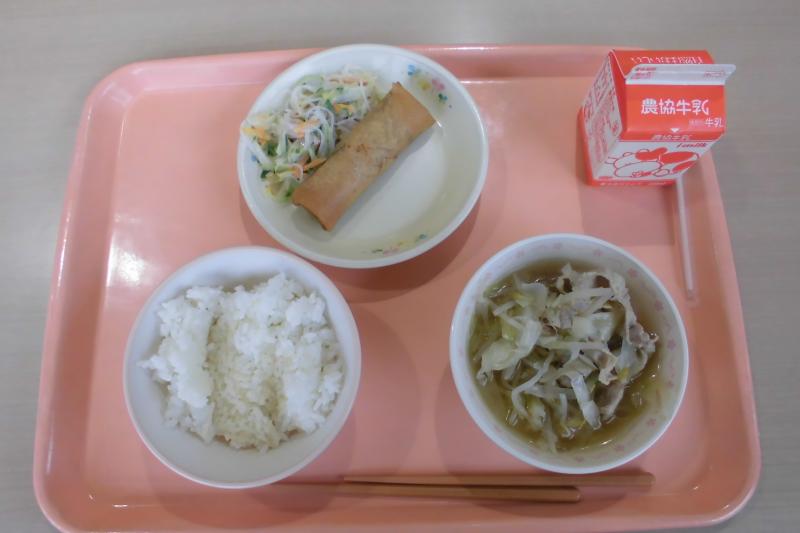 ごはん 春巻き 春雨サラダ 野菜スープ 牛乳