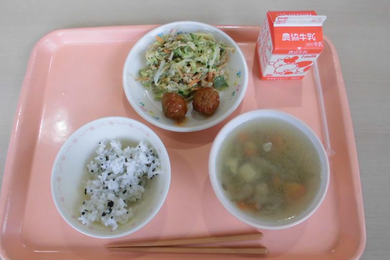 わかめごはん 肉団子 かみかみサラダ すまし汁 牛乳
