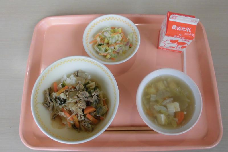 スタミナ丼 コールスローサラダ とろみスープ 牛乳