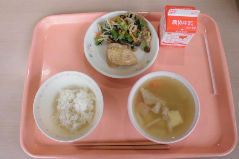 ごはん 鶏肉のみそマヨ焼き しめじ和え さつま汁 牛乳