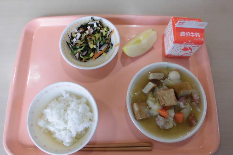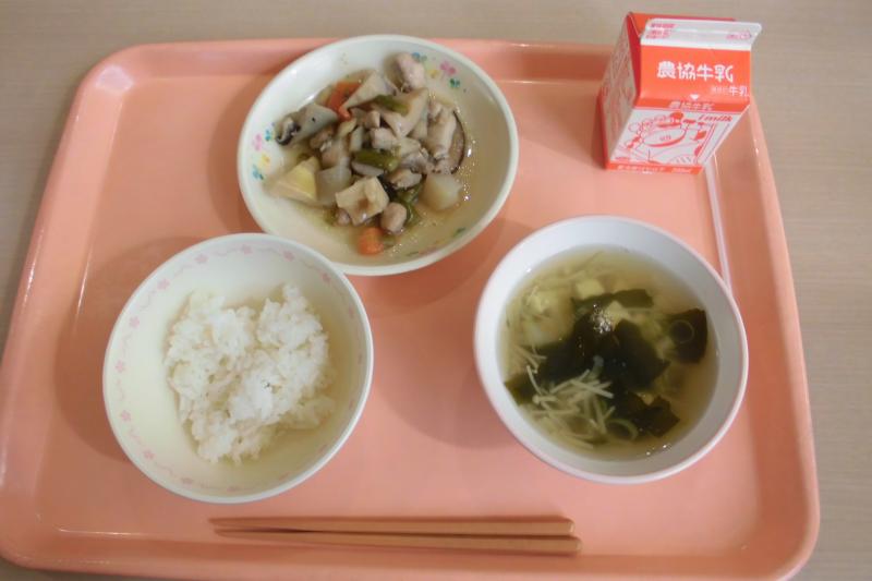 わかめごはん 厚揚げと豚肉のみそ炒め のっぺい汁 牛乳