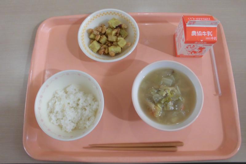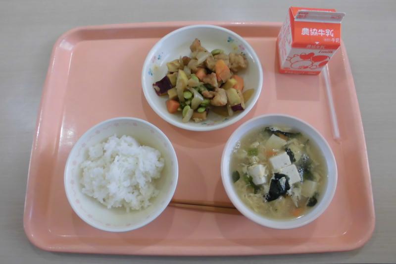 ごはん 鶏肉とさつまいもの甘酢炒め かきたま汁 牛乳