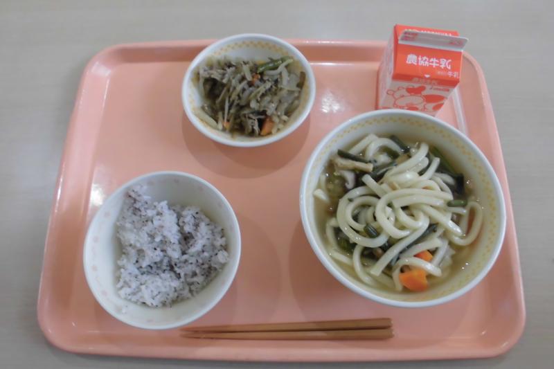 ゆかりごはん 豚肉とごぼうのきんぴら 山菜うどん 牛乳